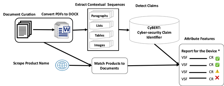 There is an urgent need in many critical infrastructure sectors, including the energy sector, for attaining detailed insights into cybersecurity features and compliance with cybersecurity requirements related to their Operational Technology (OT) deployments. Frequent feature changes of OT devices interfere with this need, posing a great risk to customers. One effective way to address this challenge is via a semi-automated cyber-physical security assurance approach, which enables verification and validation of the OT device cybersecurity claims against actual capabilities, both pre- and post-deployment. To realize this approach, this paper presents new methodology and algorithms to automatically identify cybersecurity-related claims expressed in natural language form in ICS device documents. We developed an identification process that employs natural language processing (NLP) techniques with the goal of semi-automated vetting of detected claims against their device implementation. We also present our novel NLP components for verifying feature claims against relevant cybersecurity requirements. The verification pipeline includes components such as automated vendor identification, device document curation, feature claim identification utilizing sentiment analysis for conflict resolution, and reporting of features that are claimed to be supported or indicated as unsupported. Our novel matching engine represents the first automated information system available in the cybersecurity domain that directly aids the generation of ICS compliance reports.